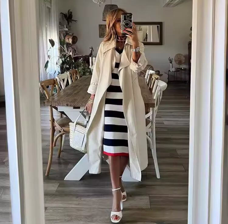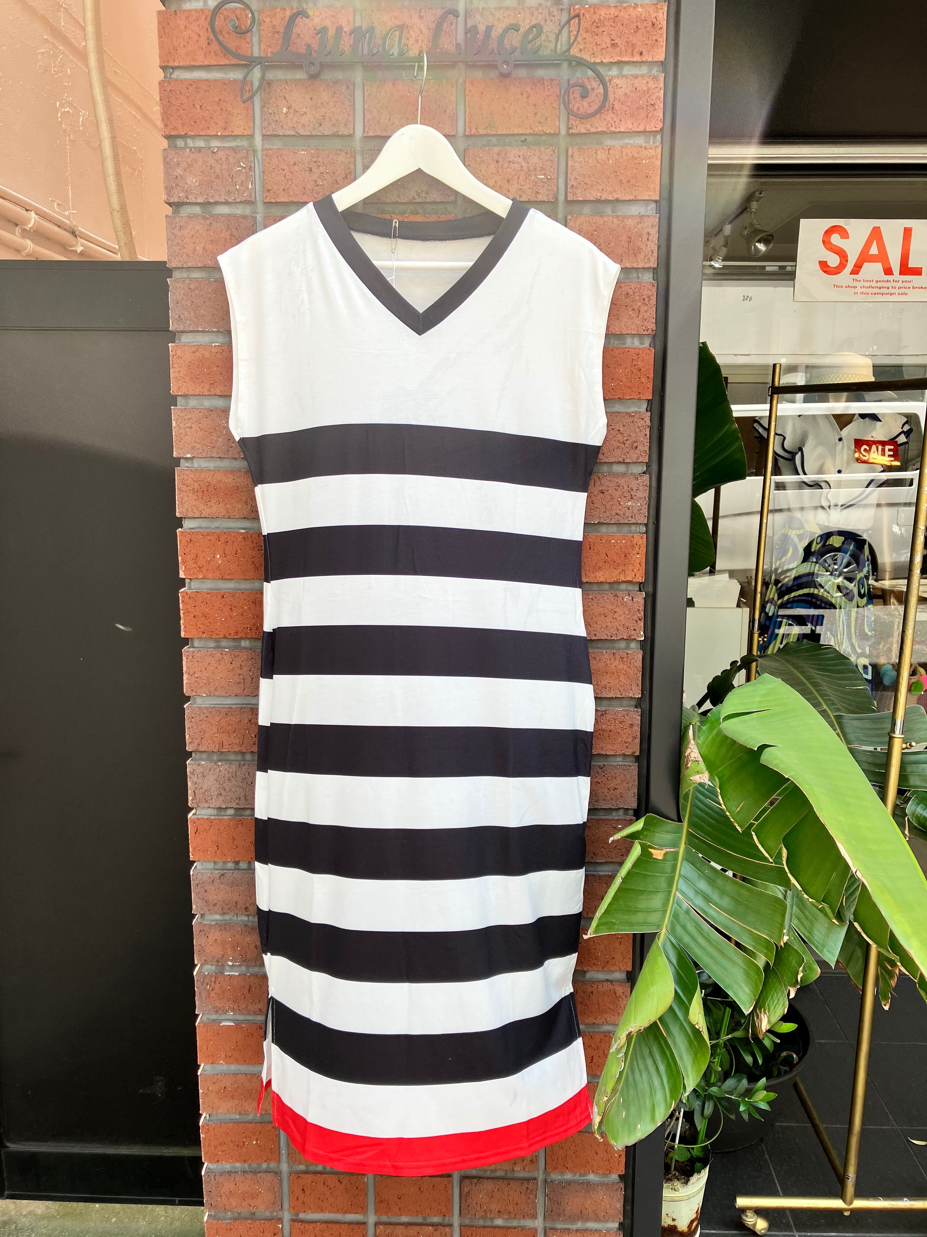 裾のレッドラインが映えるボーダーワンピースは
