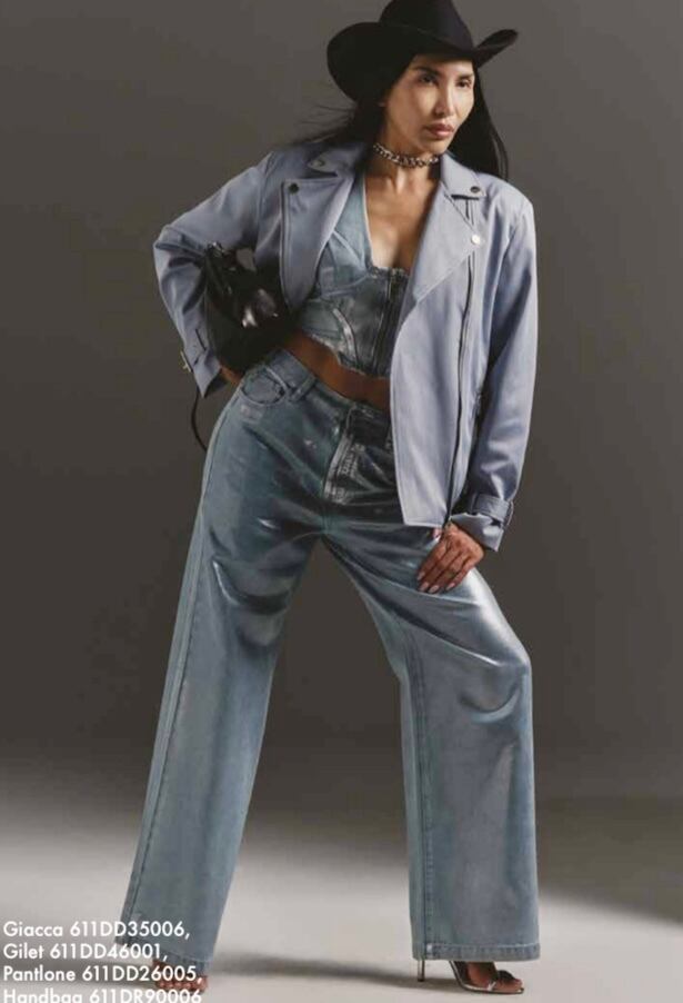 箔がラミネートされたワイドデニムは