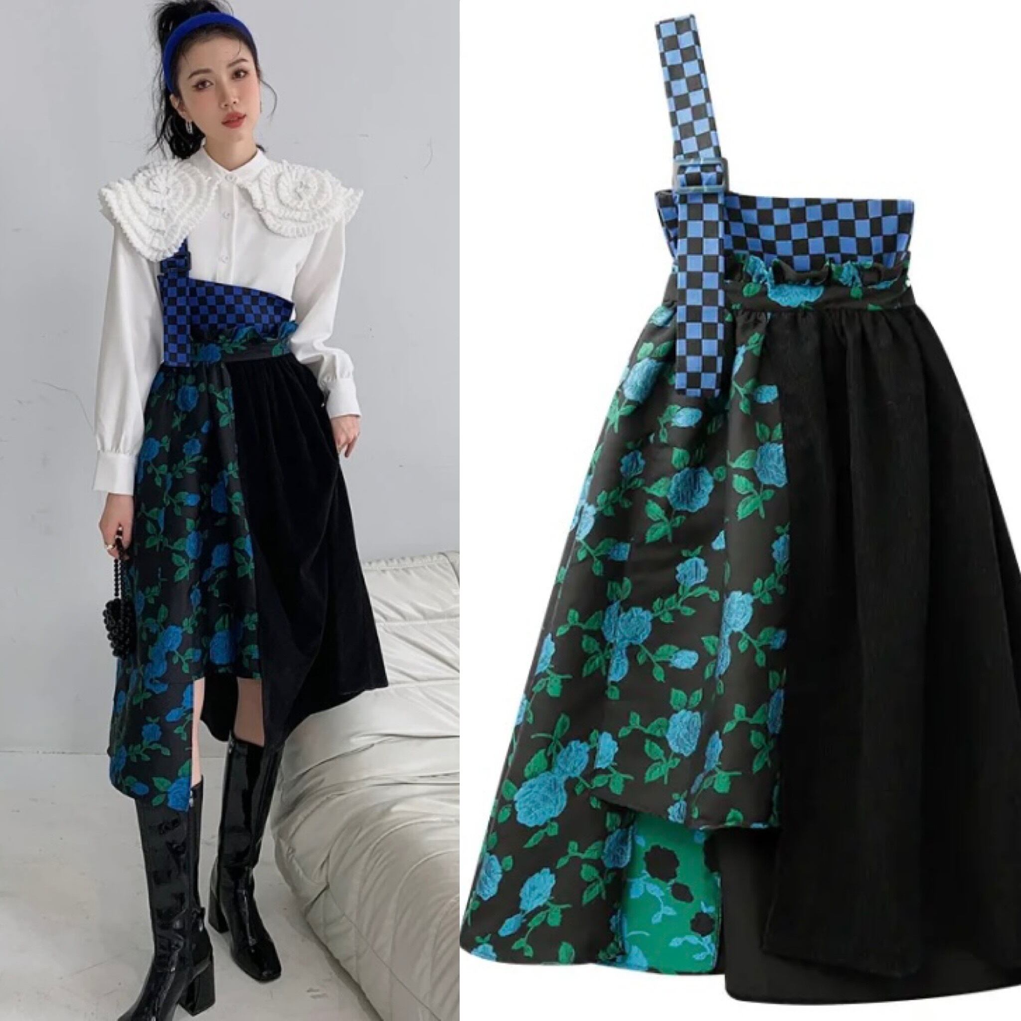 このスカートは、実はデザイナーの思いが込められた1枚。異素材使いを施す事で長い間愛用いただけるように素材にもこだわりました。ともすると派手な配色になりがちですが、ベーシックで大人っぽい印象を残すよう拘りました。