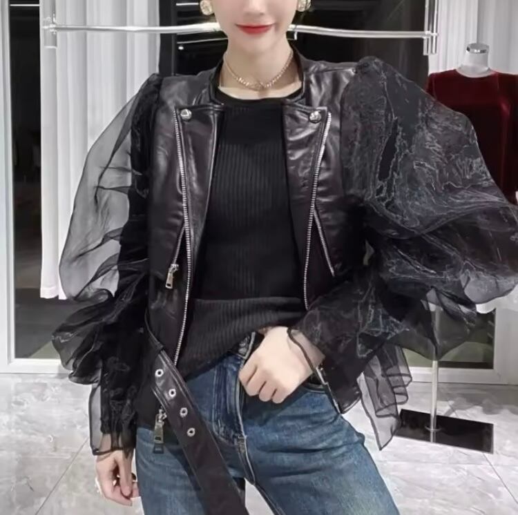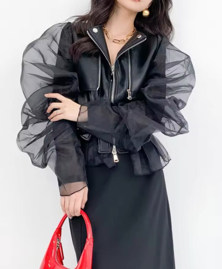 チュールスリーブエコレザージャケット